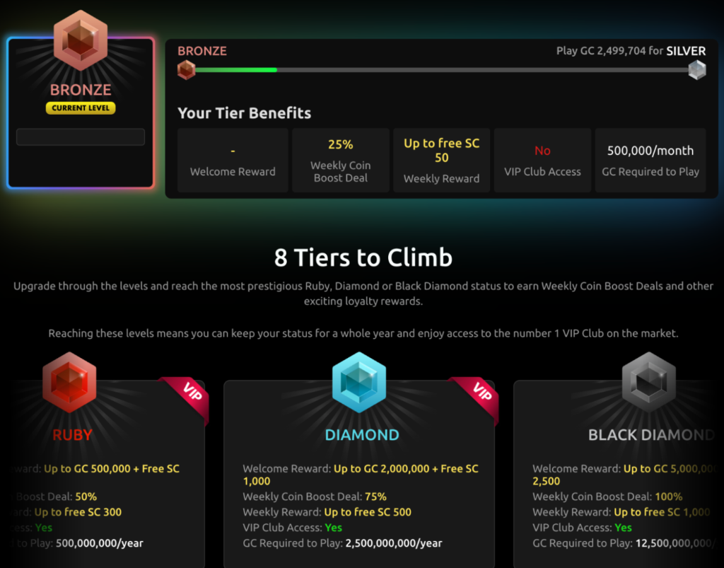 It didn’t take much play for me to unlock the bronze level (it’s just 500,000 GC played per month). I was treated to a 25% discount in a weekly coin boost deal and up to 50 in free SC every week. You can earn up to 100% coin boost and up to 1,000 in free SC weekly for the top-tier Black Diamond status.