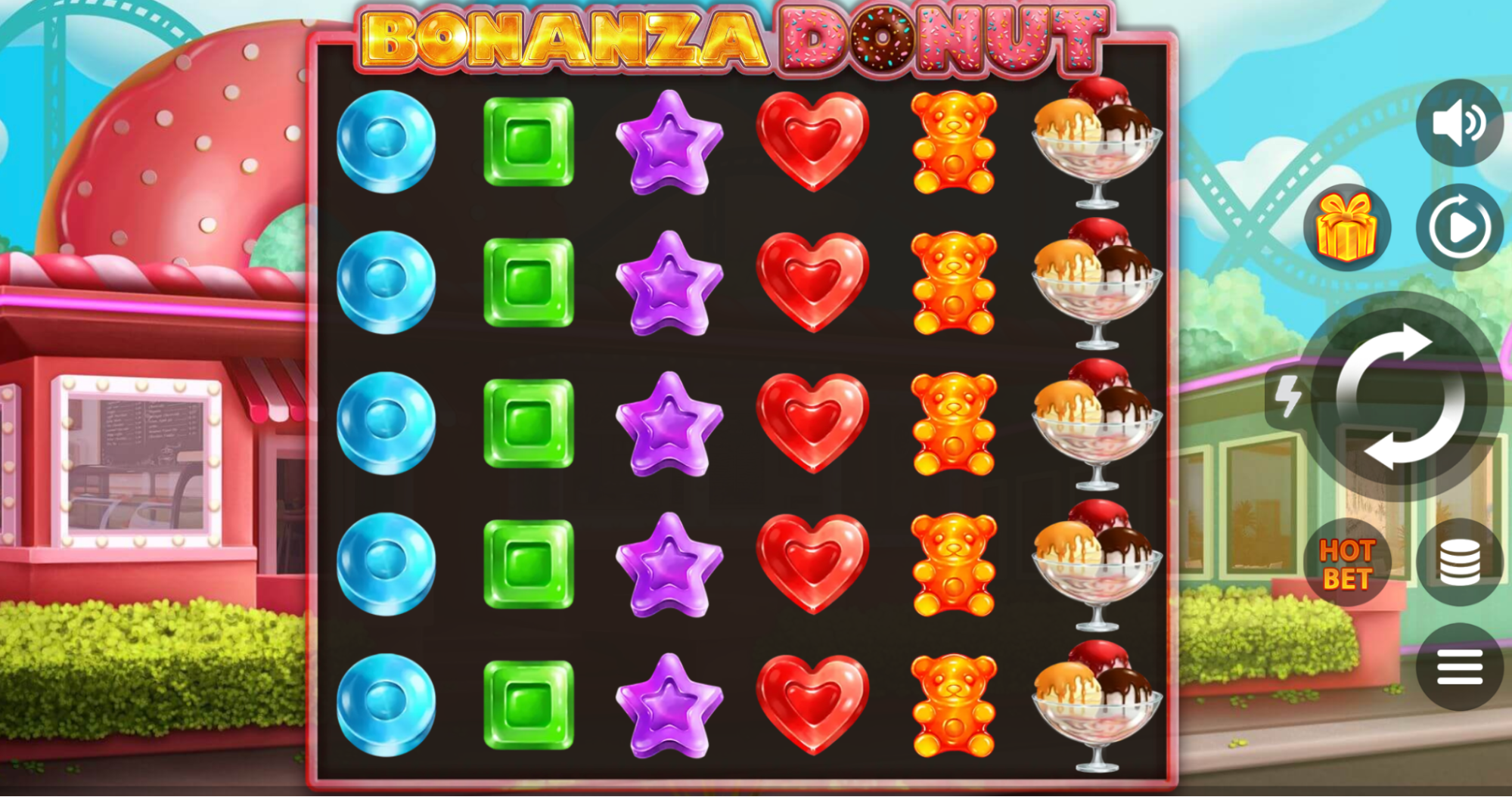 Bonanza Donut features a bright 6×5 grid filled with gummy bears, love hearts, jelly squares, cupcakes, ice cream bowls, and towering slices of chocolate cake, all paying via cluster wins of 8+ symbols. Each win triggers cascading reels, letting new treats tumble in for back-to-back hits.
