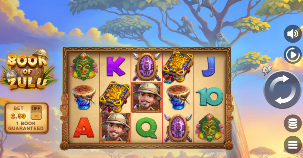 Book of Zulu takes the classic Book Of gameplay and sets it out on safari. The 5×3 grid is decorated with carved masks, drums, and wildlife, while your safari guide in his pith helmet is the top-paying symbol, worth up to 25x for a full line. As you head deeper into the plains of the savannah, you’ll run into zebras at the watering hole and baboons in the trees!