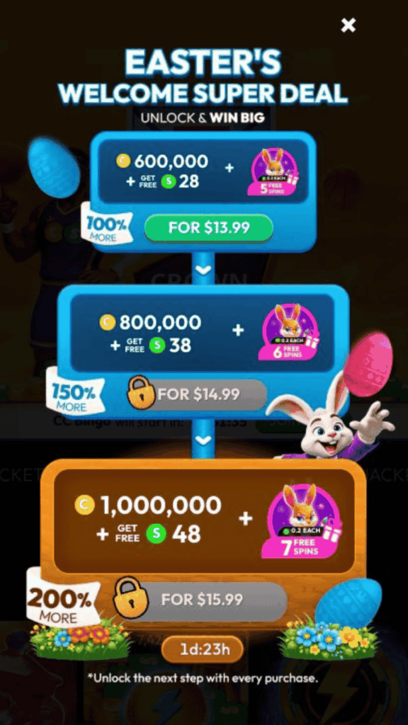 • Third purchase: 1,000,000 CC + 48 FREE SC + 7 Free Spins for $15.99 (200% more)
