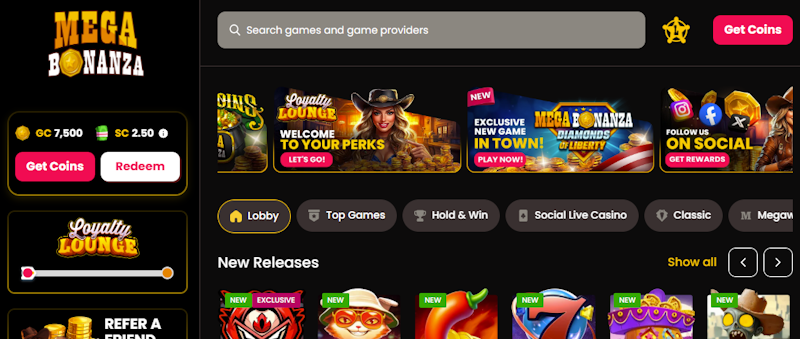 Great for: Players looking for a fresh new sweepstakes casino launched in March 2025 with a 100,000 GC + 2.5 SC welcome bonus and a 100% first-purchase boost.