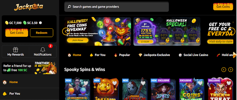 Jackpota offers larger and more diverse jackpot prizes on each of their 1,000+ slots and live dealer games. Opt in for 0.1 SC per round to win a max of 2,000,000 SC.
