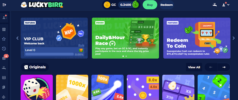 Ideal For: Luckybird.io is the best site for players who want fast payouts, offering crypto redemptions in as little as minutes.